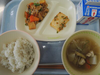 麦ご飯・牛乳・いかのゆず香味焼き・かぼちゃのそぼろ煮・けんちん汁