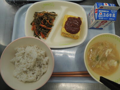 麦ご飯・牛乳・ポテトの卵焼き・茎わかめのきんぴら・みそ汁