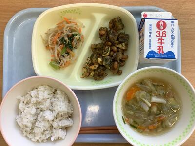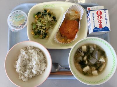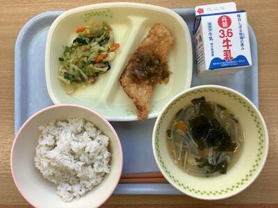 麦ご飯・牛乳・カレイの唐揚げ(ねぎソース)・野菜のオイスター炒め・ワンタンスープ