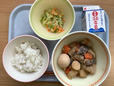 麦ご飯・牛乳・肉味噌おでん・卵のしょうゆ煮・コールスローサラダ