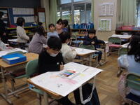 左 1年図工 「作品バッグ」にデザイン画を描いたり、互いに完成品を見たりします。
