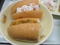 パンにポテトミートサンドとフルーツクリーム和えをはさんで食べてね。