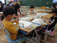 右1年図工 新聞紙を破ったものを組み合わせるといったい何に見えるかを