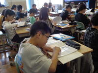 右 4年図工 「自分の顔」鏡を見ながら、目、鼻、口の特徴を捉えて