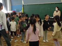 左 1年音楽 音楽に合わせて移動しながらペア活動を行います。