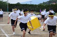 2年生学年種目「BIG BOX」です。4人で2本の棒を持ち、箱を落とさないように運ぶリレーです。4人で声をかけあって必死に走りました。