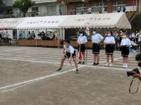 2年生の全員リレーです。バトンゾーンを工夫して使っていました。担任の先生も一緒に走っていました。