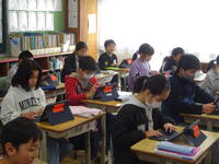 3年生の理科の授業の様子です。磁石やゴム、豆電球、風など理科の学習で学んだことを活かしたおもちゃづくりをしていました。お互いに作ったおもちゃで遊んで楽しみました。