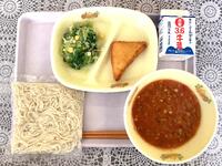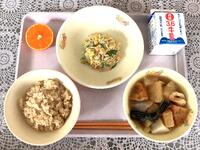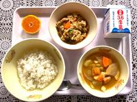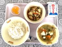 *牛乳 *麦入りごはん *生揚げの五目煮 *みそ汁 *菊花みかん