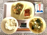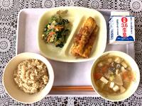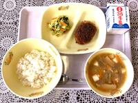 *牛乳 *麦入りごはん *いわしの生姜煮 *ごま和え *みそ汁 *おかかふりかけ
