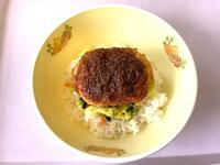 *牛乳 *あしたかつ丼(麦入りごはん・あしたかつのごまソースがけ・野菜ソテー) *たぬき汁