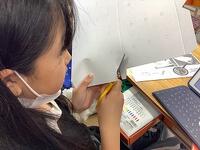 今日は「ひまわり」の練習に取り組みました。書き終えると、友達と一緒に作品を見合い、お互いの良さを伝え合っていました。