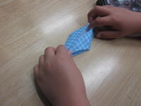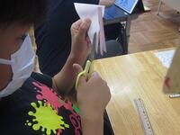 丁寧に、順番通りに折っても、上手に端が合わさらなかったり、何度も折っているうちに紙がよれてしまったりということを体験しながら、登場人物の思いに寄り添う子供たちです。