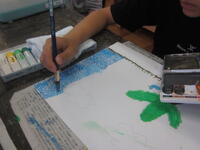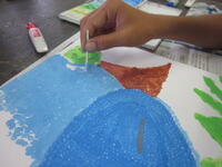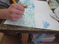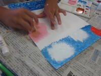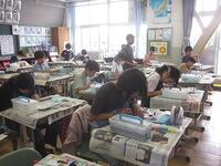 点描画に取り組んでいる6年生ですが、筆だけではなく、綿棒やティッシュなども使いながら描いていきます。また、指を使い、色塗りする子供の姿も見られました。
