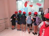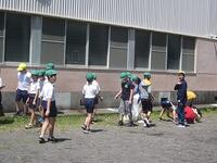 第一段ボールさんでは、段ボールの強さの秘密を教えてもらったり、実際に工場の中を歩いて作業工程などを見せてもらったりしました。段ボールの箱やうちわをもらってルンルンの3年生です。