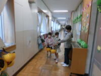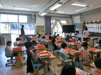 1年生の朝の様子です。6年生が朝の支度をサポートしています。