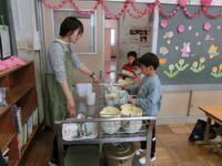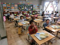 1年生は小学校で初めての給食でした。マーボー豆腐丼と牛乳をおいしくいただきました。片付けも上手にできました。