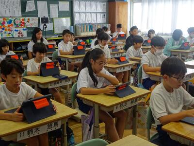 3年生では、国語のグループの話し合いや総合の新聞作りでタブレットを活用して学習を進めていました。文章の入力にも慣れ、上手に活用しています。