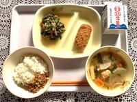 *牛乳 *麦入りごはん *里芋みしまコロッケ *煮びたし *つくね汁 *にしきふりかけ