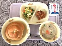 *牛乳 *黒糖うずまきパン *バーベキューチキン *チーズ入りフレンチサラダ *かぶとさつまいものクリームスープ