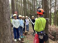 年輪から樹齢を考えたり、木を倒す方向を見極めてのこぎりを入れたりしました。木が倒れるときには、地響きのような大きな音がしました。子供たちからは、拍手が湧き上がりました。