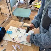 トントンと、釘を打ってコースを決めている子供たちです。友達と見合いながら、工夫しています。