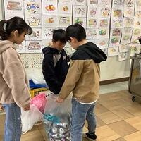 給食ボードに明日の給食を掲示したり、空き缶を回収したりしています。