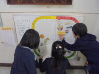 環境美化委員会では、アルミ缶やペットボトル、古紙の回収を行っています。給食委員会では、給食の食材を栄養素別に分けてみんなに見てもらえるよう活動をしています。