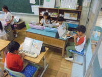 1年生の音楽では、鍵盤ハーモニカの練習を友達と一緒に演奏したり、個人練習に励んだりして学習の方法を選んで取り組んでいました。