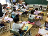 1年生の授業の様子です。ひらがなプリントをファイルにとじていました。