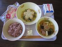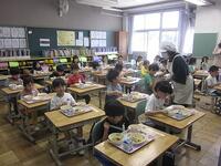 「祝」が書かれたかまぼこに、花びらの形のハンバーグ、そしてお赤飯で、南っ子の入学・進級をお祝いしました。