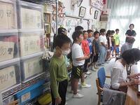 紙紐や半紙を使ってアンモナイトの形を作る子供たちです。色づけも、とてもカラフルでかわいらしい仕上がりです。