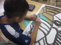 カッターナイフを使って切った枠の中に、絵の具を使って色をつけていきます。