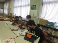豊臣秀吉について調べている子供たち。タブレット端末を使ったり、図書室で本を使って調べたりしています。