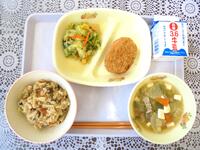 *牛乳 *たけのこごはん *みしまコロッケ *三色和え *とん汁
