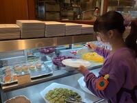 ビュッフェスタイルの朝食です。自分の食べられるものや量を選んでいます。