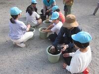 大きめの植木鉢に土を入れ、その中に穴を掘って植える子供たちです。これから、自分の苗を育てていきます。