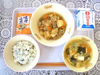 *牛乳 *わかめごはん *肉じゃが *かきたまみそ汁 *味付小魚