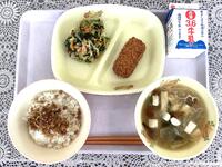 *牛乳 *麦入りごはん *里芋みしまコロッケ *磯香和え *みそ汁 *手作りふりかけ