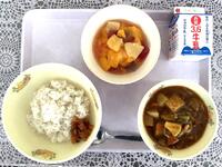 *牛乳 *ミートボールカレー *福神漬け *フルーツカクテル