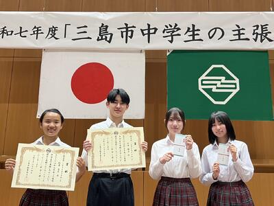 三島市スピーチコンテストが開催されました。どの発表も堂々としており、内容も素晴らしく、大変感動しました。本校から出場した生徒のうち1人が見事に入賞し、さらに東部大会の代表として選ばれました。今後の活躍もとても楽しみです。