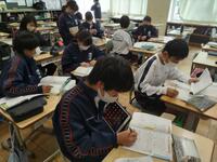 2月8日(水)、定期テストの休み時間、必死に勉強です。先ほどのテストを確認し合ったり、次のテストの復習です。