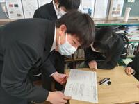 2月8日(水)、定期テストの休み時間、必死に勉強です。先ほどのテストを確認し合ったり、次のテストの復習です。