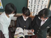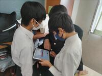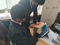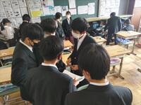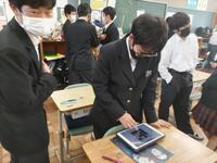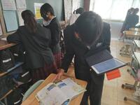 2月8日(水)、2年生の定期テストの休み時間の様子です。タブレットで次のテストの内容を確認し合います。