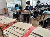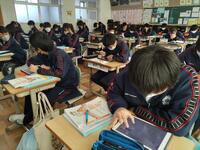 2月7日(火)、1年生の授業、数学は単元別のプリントでテスト対策、保体はバレーボール、社会科は鎌倉時代の文化です。
