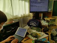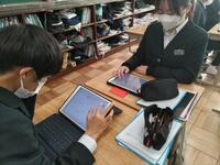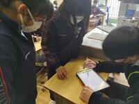 2月6日(月)、3年生の英語授業、一人一人が英作文した一文を、グループでまとめて文章にしていきます。