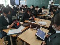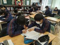 2月7日(火)、2年生の授業、国語は走れメロスの終末、数学はテストに向けて教え合い、社会科は西南戦争です。