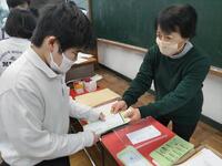 1月24日(火)、特別支援学級の生徒が封筒のリサイクルです。古封筒に宛名書きを貼り、教師に提出後、事務室に納品です。