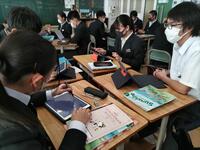 2月6日(月)、3年生の英語授業、一人一人が英作文した一文を、グループでまとめて文章にしていきます。