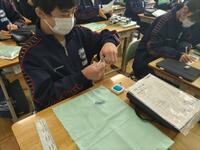 2月17日(金)、2年生の授業、保体はサッカー、数学は単元のまとめ、家庭科は裁縫です。